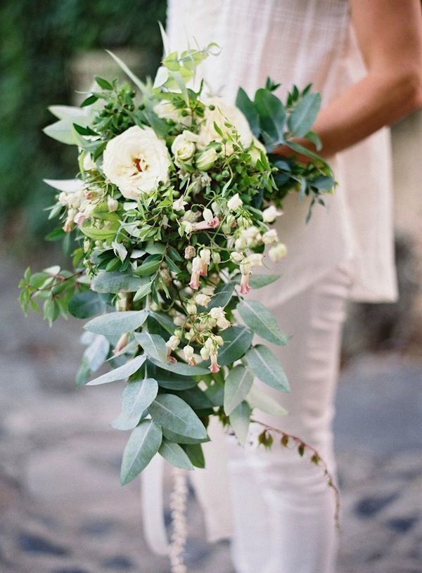 Bukiet kaskadowy pięknie współgra z dramatycznym krojem sukni, tworząc spójny i elegancki efekt. Można go uzupełnić długimi pnączami eukaliptusa lub delikatnie opadającymi kwiatami, np. storczykami, które dodadzą wrażenia lekkości.